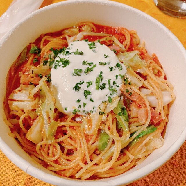 辛口トマトクリームパスタ 〜卵黄をのせて〜 セパレート容器でアルデンテのままだったパスタ