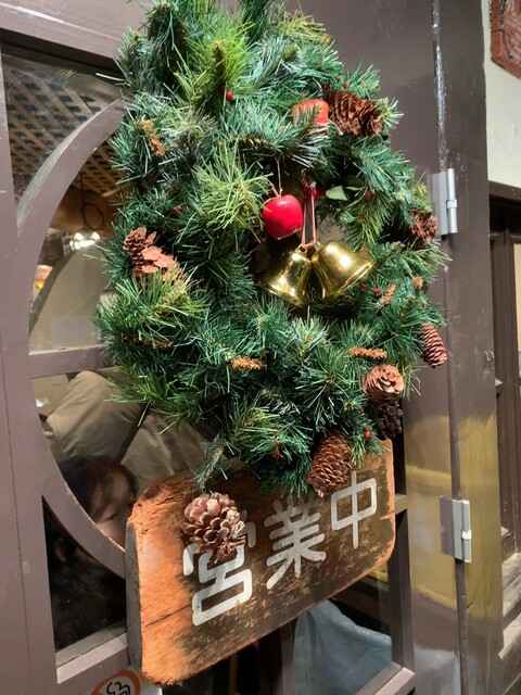 受取希望時刻3分前に到着。店頭にはミニクリスマスツリー、入口扉にはクリスマスリースが飾られ、早くもクリスマスの装いです。