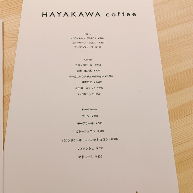 ご店主から差し出された3枚紙のメニューを見ると、ドリンクは6種類の豆から選べるハンドドリップコーヒーの他、エスプレッソベースのアレンジコーヒー各種、シェイク、更にはアルコール類など。スイーツは6種類が並んでいます。