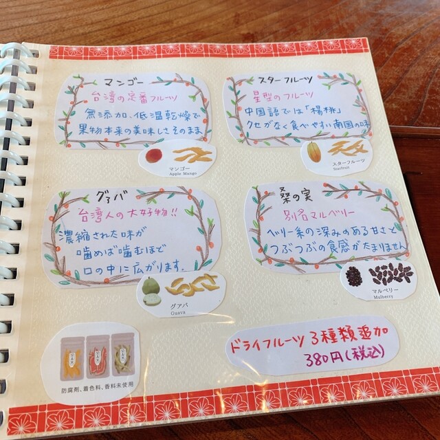 特選茶2種から茶1種、ドライフルーツ8種から3種を選べます。悩んだ末、お茶は紅玉紅茶、ドライフルーツはドラゴンフルーツ、紅心グァバ、グリーンマンゴーをチョイスしました。