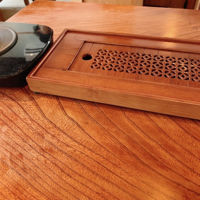 店内に先客は無く、「お好きな席にどうぞ」とのことでしたので、奥から2番目の2人掛けテーブルに壁を背にして腰を下ろしました。テーブル上にはお湯を沸かす電熱器と茶盤が置かれています。