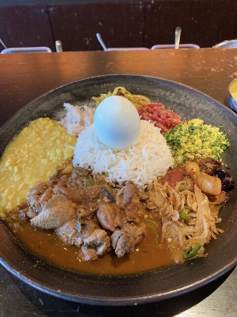 待つこと7、8分で薬膳スリランカプレート 3種が着膳。大きなプレートの中央にはバスマティライス、その上には茹で卵が乗り、その周りにチキンカレー、パリップ(豆のカレー)、それからケール、白菜、レンコンなど副菜6種が盛られています。そして、別容器でカボチャのカレー、キーマカレー、更にサービスでヤーコンのカレーまで付いて来ました。パリップとヤーコンのカレーを含め、実質カレー5種盛りという豪華版です。