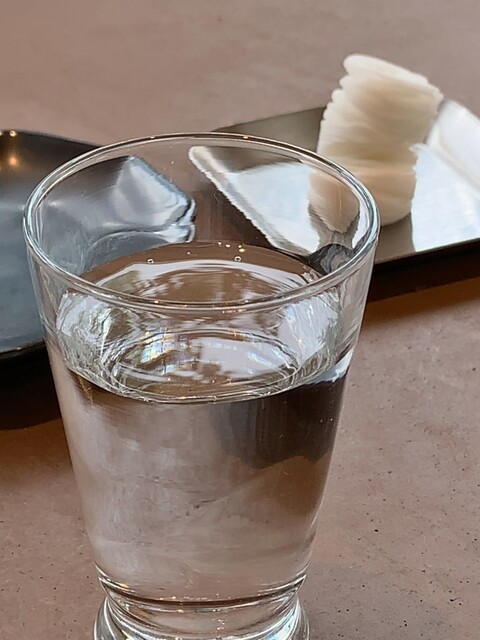 初めに提供された冷水 右奥は水を掛けて膨張したお手拭き