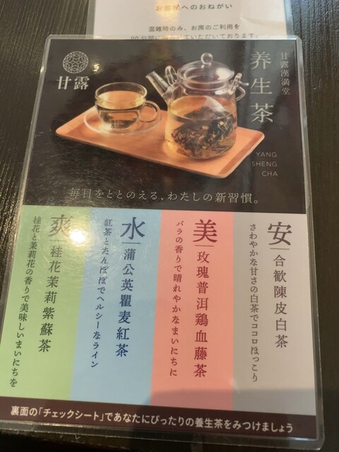 暫し悩んだ末、先程の男性スタッフを呼び、中国茶は薬膳茶7種の中から皇菊茶 990円、スイーツは桃膠(桃の樹液)6種の中から無花果銀耳桃膠 770円(いずれも税込)を注文しました。無花果銀耳桃膠は温冷いずれでも提供可とのことでしたが、この日は暖かかったので、冷たいのをいただくことにしました。