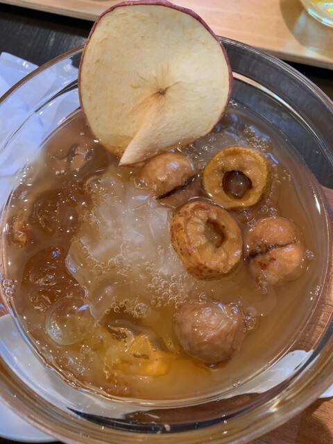 無花果銀耳桃膠は、滋養や美容効果が高いという桃の樹液入りのシロップの中に、乾燥いちじく、乾燥りんご、白きくらげがたっぷり入っています。ほんのり甘い優しい味で、皇菊茶同様、如何にも健康に良さそうなスイーツです。