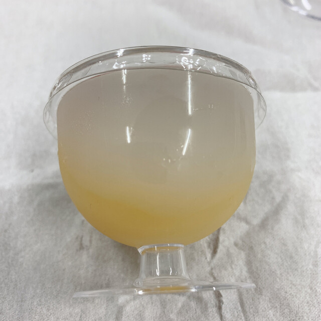 4品目は、白桃水ようかん。これも賞味期間は3日間。楕円形のプラスチック容器の中は三層に分かれていて、一番上に白桃2切れ入りの透明なゼリー、真ん中にピンク色のムース、そして一番底に白手亡の水ようかん。白桃入りゼリーと白い水ようかんのそれぞれは美味しいのですが、これを一緒の容器に入れて一つのお菓子にするのは些か無理やりのような気がしました。
