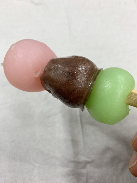 真ん中に小豆餡の玉、その上にピンク色、その下に黄緑色の団子を串刺ししてあります。