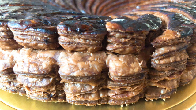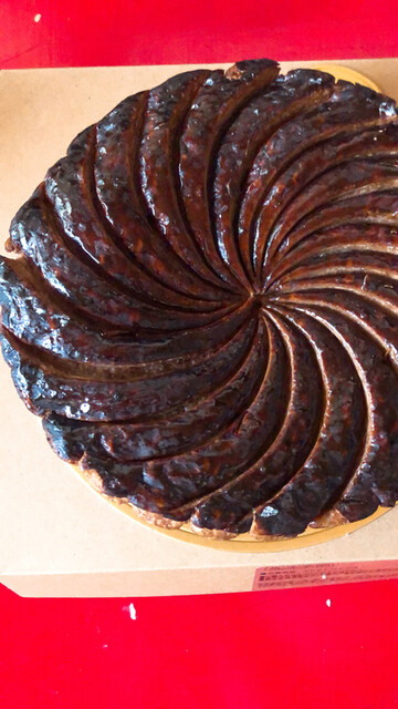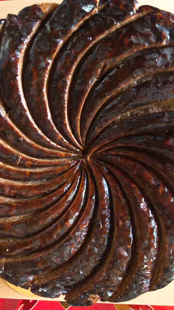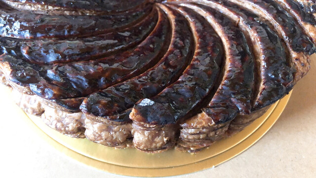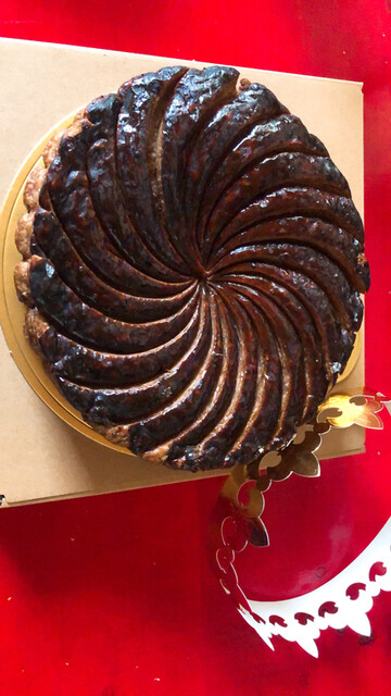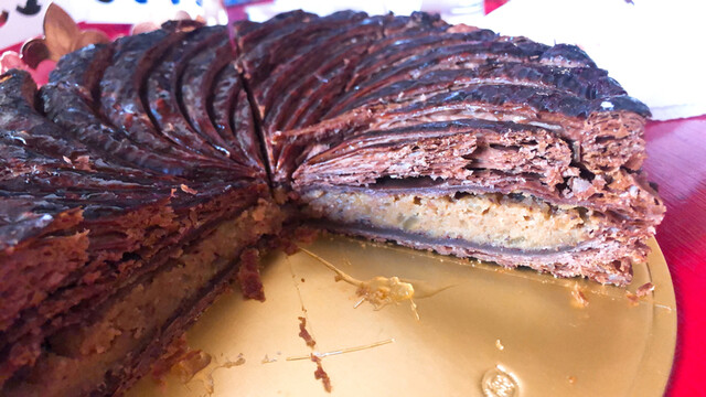 美しいフォルムが素晴らしくてしばし鑑賞。フェーブは入ってないけど、ショコラのパイ生地に、風味豊かなヘーゼルナッツとレモンのクリームが入ってて層になってて切ったらまた美しくてしばし鑑賞。