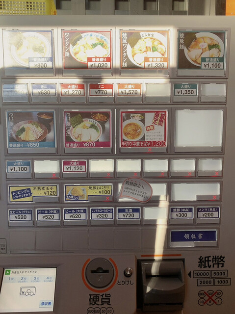 やはり、期間限定「手切り中華そば」、数量限定「焼豚おにぎり」は品切れですね... 「焼豚麺 1100円」をポチッと押し店内へ。久しぶりに福島に帰ってきたと実感できる瞬間。