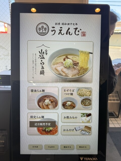 券売機を見ると、チャーシュー麺・煮卵・担々麺・ご飯類などは「終了」の表示。品切れというより、初日のためにメニューを絞っているようにも見えました。今回は看板メニューの「会津山塩らぁ麺」と「ワンタン」を購入。麺は中太と極太から選べるので、極太をチョイス。
