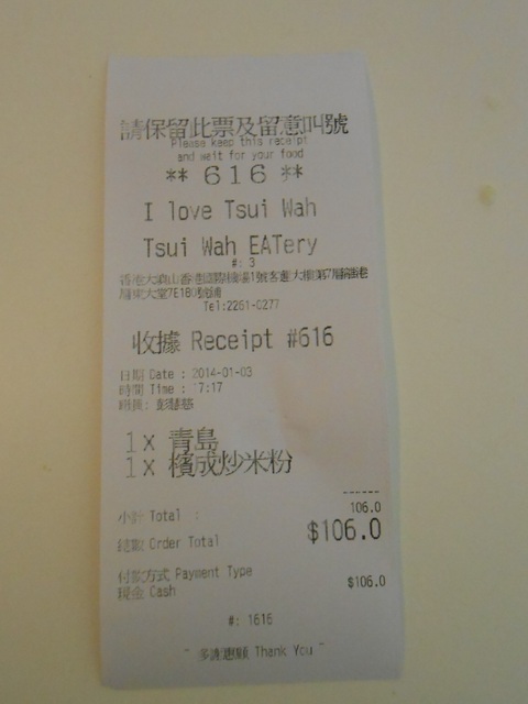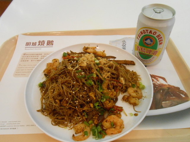 ビーフン(フライド・ライス・ヌードル)が76HKD、青島ビールが30HKDで106HKD。