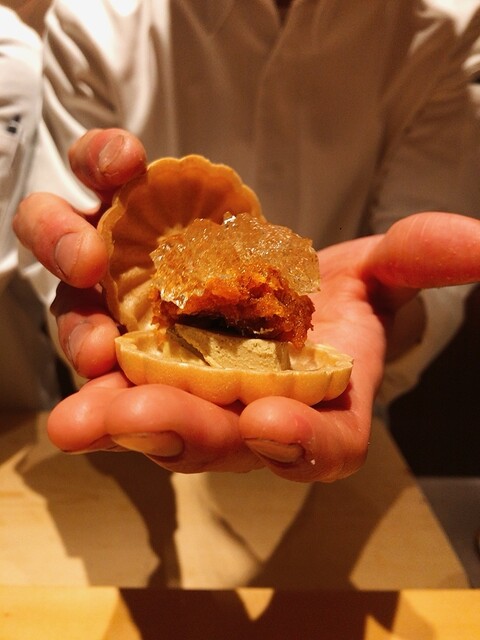 次は大好きな鰻☆大将鰻を焼いている。同じ職人さんの焼いている姿であっても、しのはら大将が焼いていると、鰻屋さんの豪快なおいしそうな感じとは違って、風流で上品。あまりもくもく煙上がったりしないし、タレ取り替え用のお皿も高級そうなもの。
