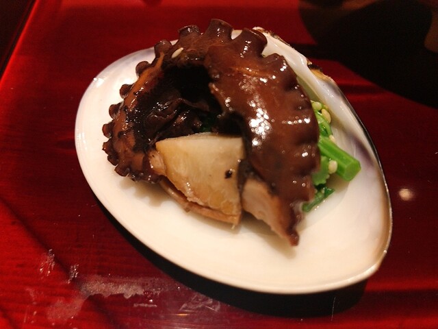 小蛤(といっても5センチくらい)の貝殻の器の中は、8絶妙な食感と味付けに仕上げた蛸など。