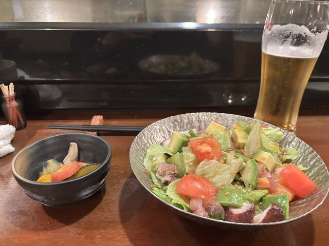 付き出し、海鮮アボカドサラダ、鳥軟骨唐揚げ、焼きエリンギポン酢、炙り鯛お茶漬け、生ビール、日本酒の浦霞