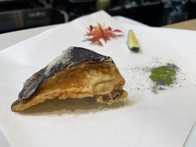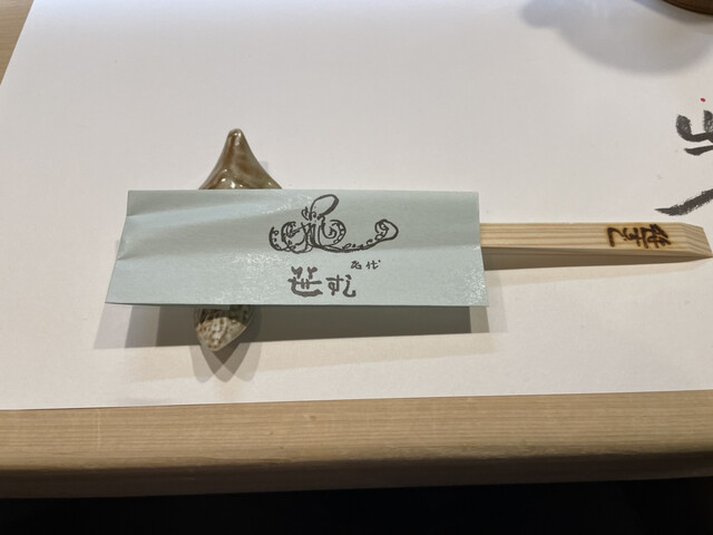 今日もお任せでお願いしましたが、地元の湖山池で取れた湖山エビ(テナガエビですが、地元ではこう呼ぶそうです。また余談ですが、湖山池は「池」と名のつく湖沼の中では日本最大の広さだそうです)や隠岐島の牡蠣、舞鶴の生鳥貝、シロイカ、猛者エビなど、鳥取のみならず近海の貴重な食材を頂きました。湖山エビは7匹しかあがらなかったそうで、これは素揚げで出してくれました。