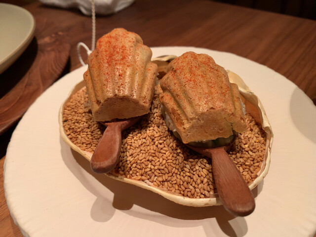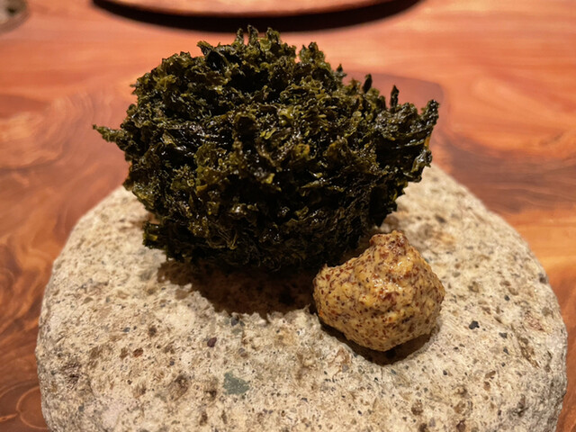 真つぶ貝とすじのりのソース。真つぶ貝は貝殻の中にオイルでアヒージョになっています。添えてあるすじのりのソースにつけていただきます。これも食感が絶妙。貝の身を刺しているのはクロモジの枝。