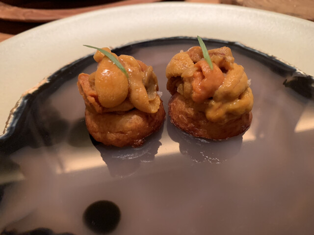 飲み物はいつもお料理に合わせたペアリングをオーダー。ウニを使ったお料理には日本酒を合わせていただくなど、いつも型にとらわれず、素晴らしいマリアージュを演出してくれます。
