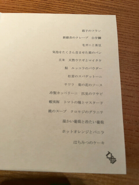 いつもなら食事の写真、飲み物の写真、その他の写真と並べるのですが、季節をいただくというこちらのお店のコンセプトに敬意を表して、今日のコースのコンセプトとメニューを最初に持ってきました。