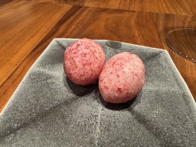 アルコールは、料理が料理なので基本はスパークリングや白、赤、オレンジなどのワインですが、シェリーや日本酒などをお量に合わせて出していただけます。全ての料理ごとにアルコールが少しずつでてきますので、飽きることなくいろんなものを楽しめますし、「なるほど!確かにこれには日本酒が合うね!」という物が出てくるので楽しみでもあります。