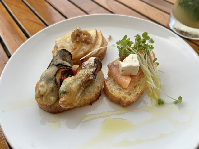 燻製オイスター、林檎と胡桃のゴルゴンゾーラ、