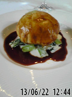 私は、玉葱の、冷たいポタージュ、メインは、豚肉のパイ包み、デザートは、