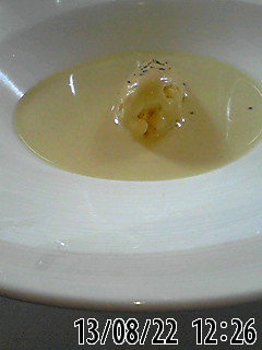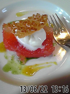 前菜は、2人づつに別れ、私たちは、とうもろこしの冷たいアイスとポタージュ。