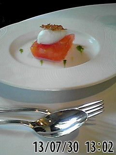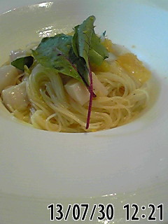 メニューから、(3択で)前菜は、ホタテと、オレンジ?のパスタ。
