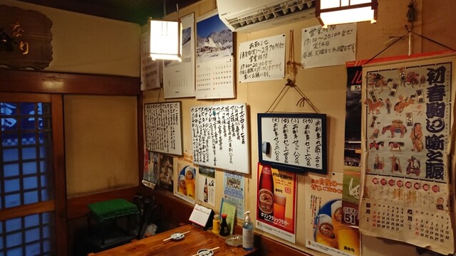店内はカウンタ-席と四人掛け座席の配置。奥に座敷席が配置されております。