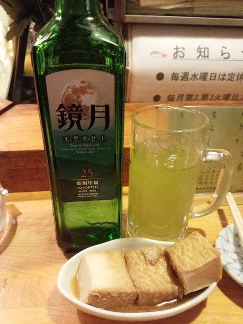 いつも飲んでいる『鏡月』のお茶割り、粉茶のペットボトルで出てきます。素敵です。