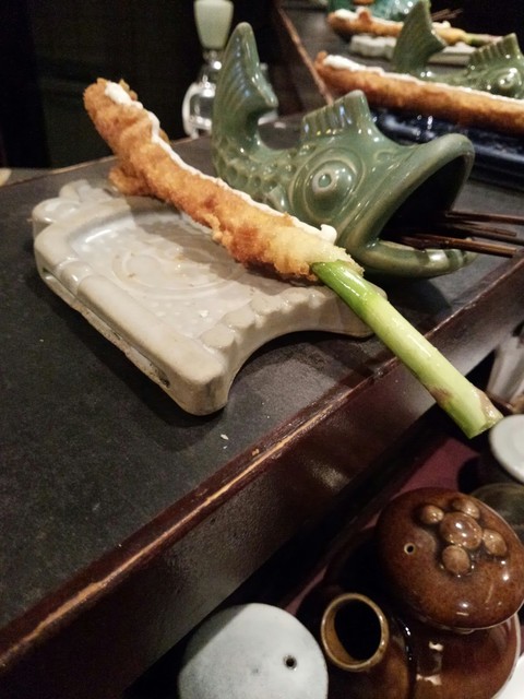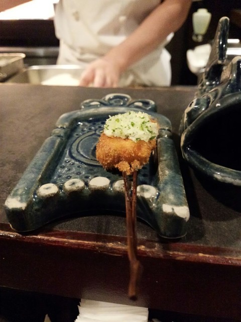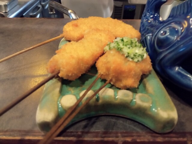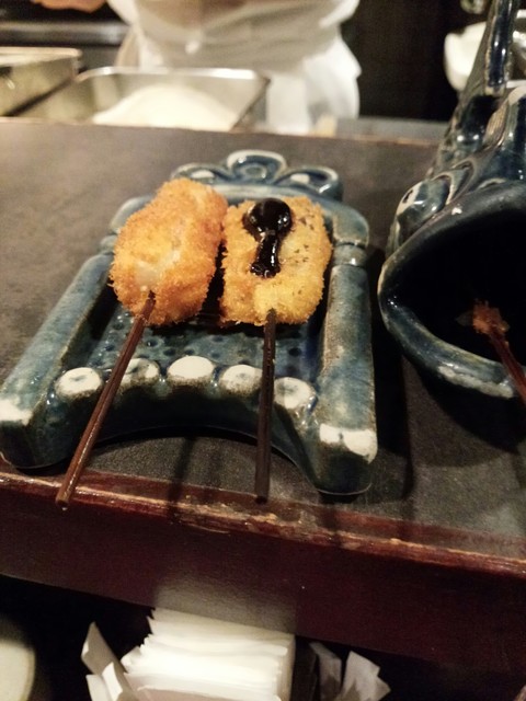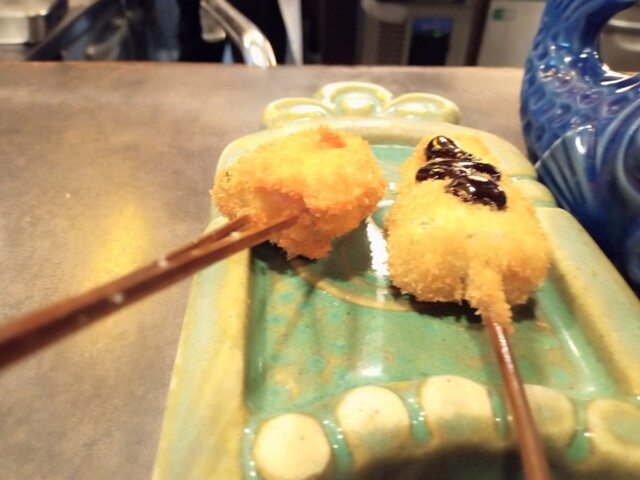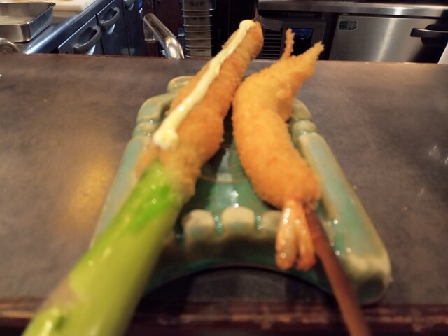 職人さんの機敏な手際で揚げる串揚げ。揚げには細かいパン粉を使用しており、食べ終わった後は胃もたれもありません。揚げ方が拙かったりパン粉が粗いとこうはいきません、良い仕事です。
