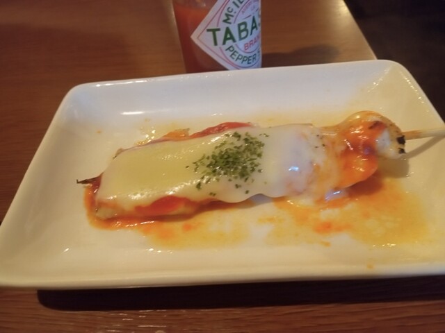 武蔵小杉の某有名焼き鳥店直伝の品。ピ-マン、チ-ズ、鶏肉で三種の神器。タバスコを少しだけ垂らして口に入れると至福です。
