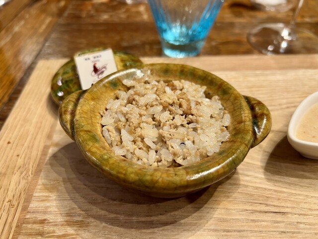 川俣シャモ御飯(酒米の亀の尾を薪で炊いて、川俣シャモの挽き肉を乗せ、シャモ出汁で伸ばした天然自然薯とろろ添え)