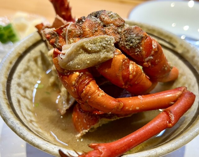 ◆加能ガニ(解し身の蟹味噌和えを甲羅に詰めて三杯酢を添えて)