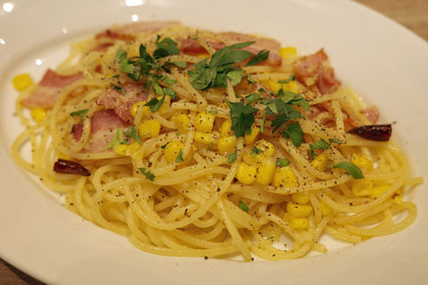 軽く炙ったトウモロコシとベーコンのクリームソース