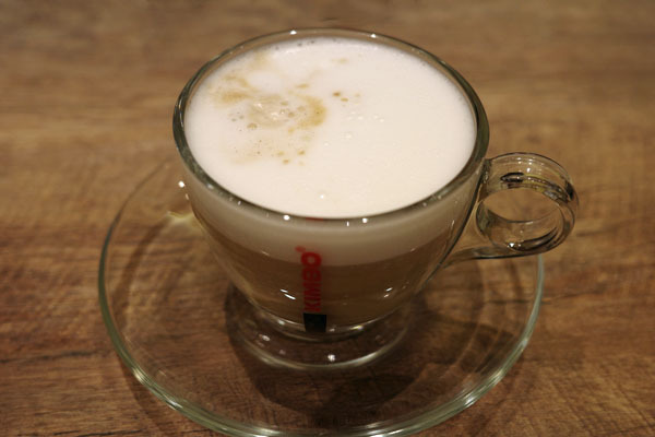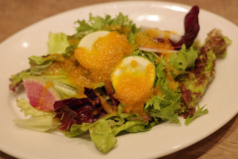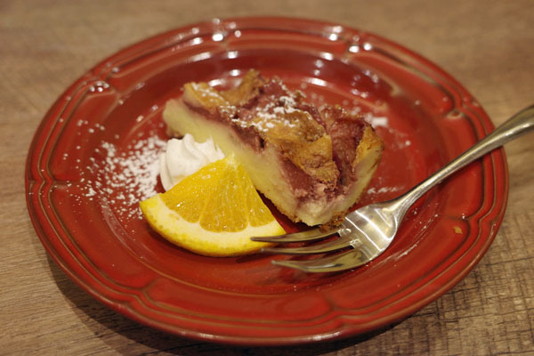 サラダにカフェラテ、そして机上のドルチェメニューからいちごのクラフティを。