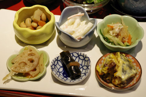 この日の焼き魚は西京焼き、6種の小鉢、サラダ、茶碗蒸し、にゅうめん、吸い物、炊き込みご飯が付きます。