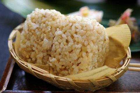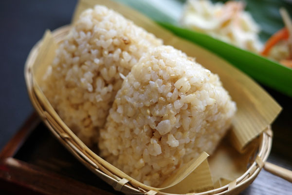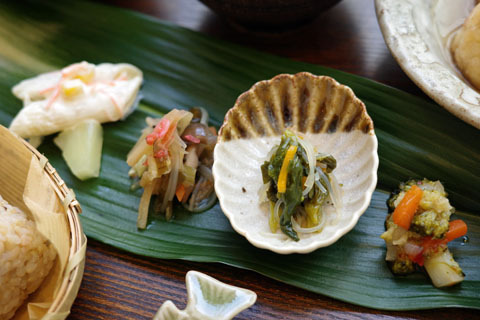食事は日替メインにおそうざい4種、冷奴、みそ汁、玄米おにぎりの田舎定食。