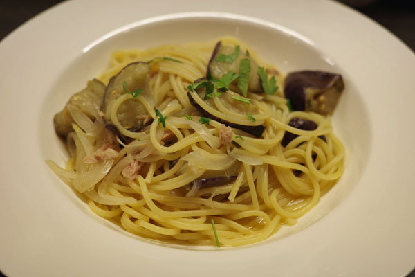 パスタはジェノベーゼが名物と書かれていますが、ナスにひかれてツナと揚げナスとバジルの和風パスタをいただきました。