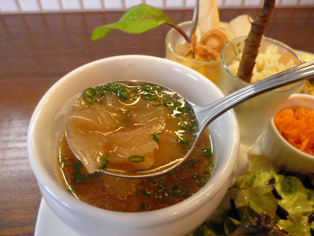 ハモンセラーノが使われた深い味わいのあるスープ♪プレートの片隅にもお花畑が〜〜〜