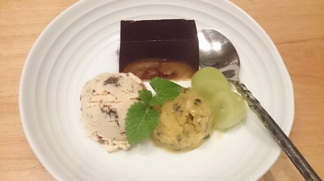 デザートはいちじくのゼリー・ラムレーズンアイス・パッションフルーツのソルベ。