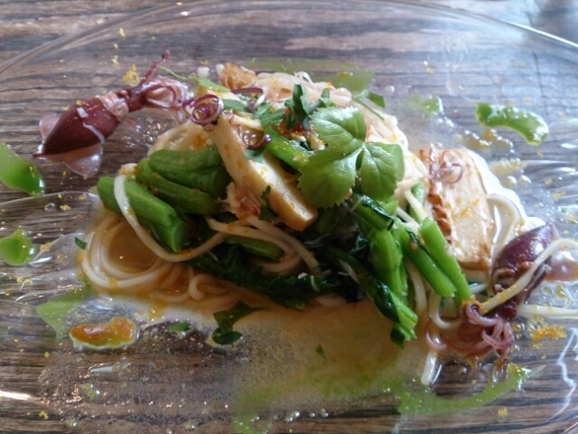 ほたるいか・カラスミ・たけのこ・菜の花と旬がいっぱい詰まった豪華なパスタ。
