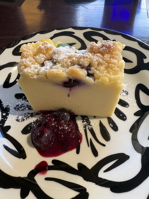 カップとソーサーも意匠があり、コーヒーの味を美味しく感じさせてくれました。チーズケーキもずっしり濃厚。クランブルとブルーベリージャムがよく引き立てて相性抜群。