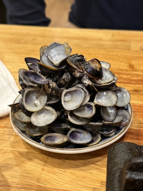 まずはレバーを焼いて食べ、そこにホルモンや野菜をしじみとしじみ出汁で食べる。