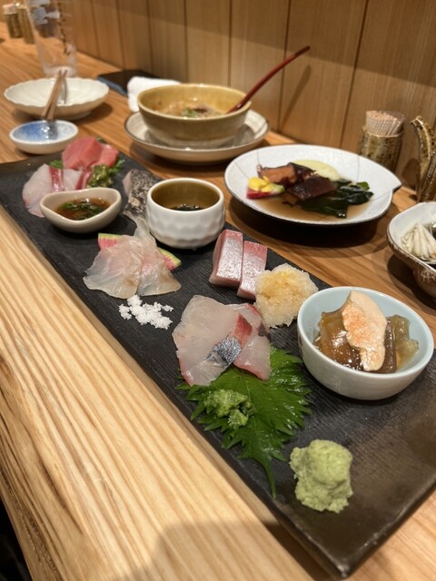 大阪駅前第2ビルの行きつけのお店です。カウンターで3人で飲みました。相変わらずここのお造りは最高に美味い!たまごサラダと茄子の揚げ浸しが私のルーティンになってます?日本酒の種類も豊富でどこで飲むか迷ったら必ずこの店に来てしまいます。