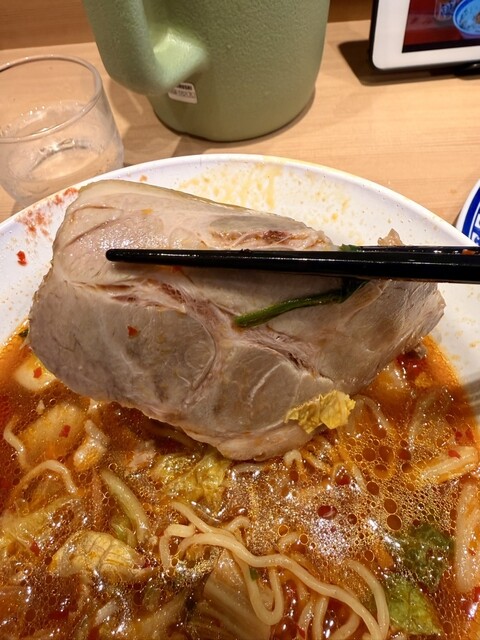 まずはスープから啜ります。ガツンとくるのは二郎系でも同じかもしれませんが、辛みだけでなく白菜の甘味が加わるので、やはり美味しい。しかし塩味は強目で必ずスープは残る(残さなければならない)パターン。ちぢれ麺と白菜を同時に口に頬ばれば、う〜〜〜まい!