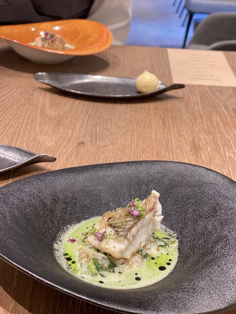 真鯛の鱗焼き。サクサクの鱗が心地よい。タイカレーソースとリゾットでいただく。かなり好み。