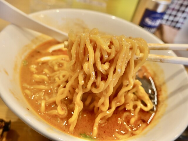 これに合わせた中太の縮れ麺がプリップリで、旨いスープを纏って来てガンガンと食が進みます。