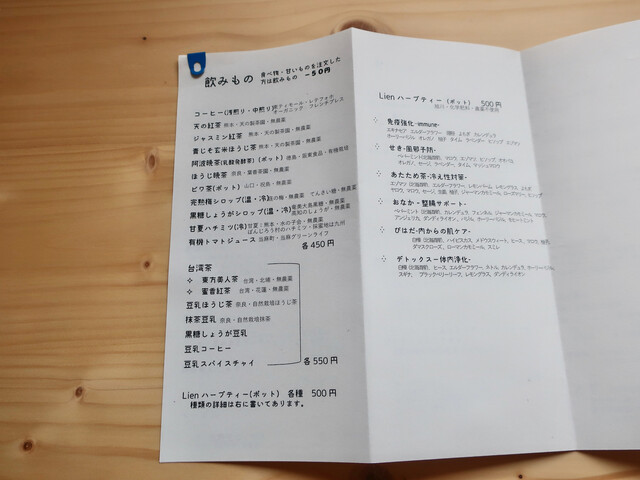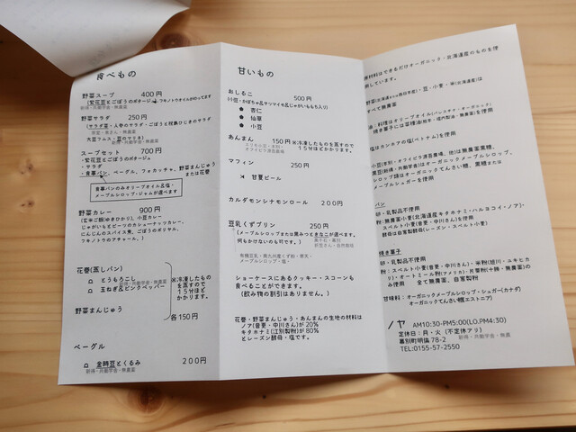 お食事メニューは野菜カレー、野菜スープがメインで、他にベーグルなどのパン類、お汁粉などの甘いものがあります。