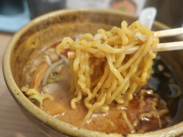 硬目に茹で上げられた中太の縮れ麺は、以前の「味噌ラーメン」よりも若干ながら太目に感じた。うん、これも良いわ!