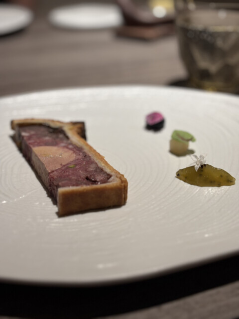 パテの真ん中にはフォアグラのテリーヌ、パテには鹿、猪、熊、穴熊の4種類のジビエを融合させたパテ